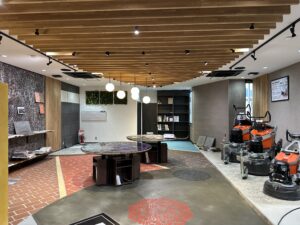 内装は外構に使用するスプレーコンクリート、スタンプコンクリートや内装に使うTFフロアやタイル、塩ビタイル、フローリングなど色々展示しています。