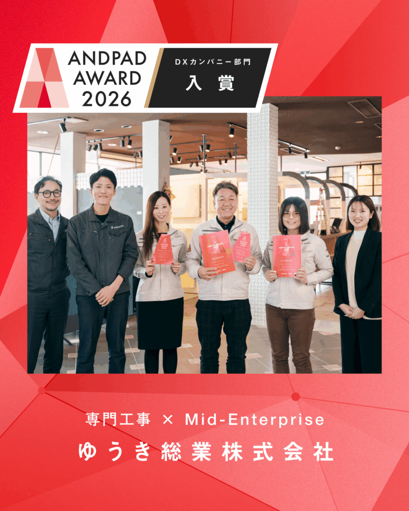 ゆうき総業株式会社は、クラウド型建設プロジェクト管理サービス「ANDPAD」を運営する株式会社アンドパッド(本社:東京都港区、代表取締役:稲田武夫、以下アンドパッド)主催の ANDPAD AWARD 2026 DXカンパニー部門 専門工事×Mid-Enterpriseカテゴリにおいて入賞企業に選出されましたことをお知らせいたします。