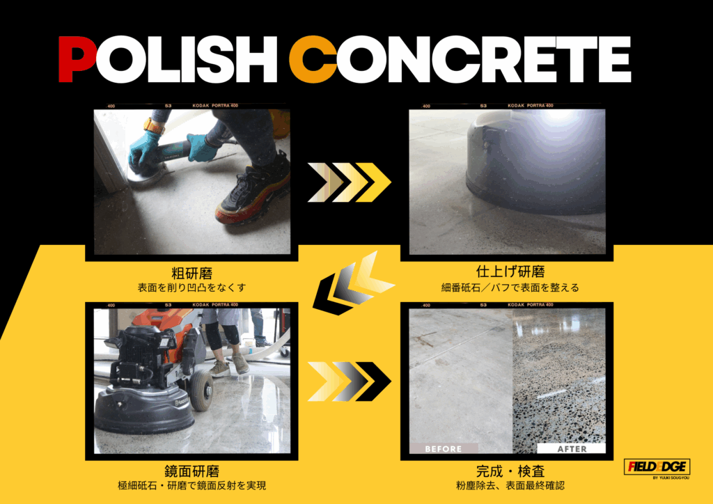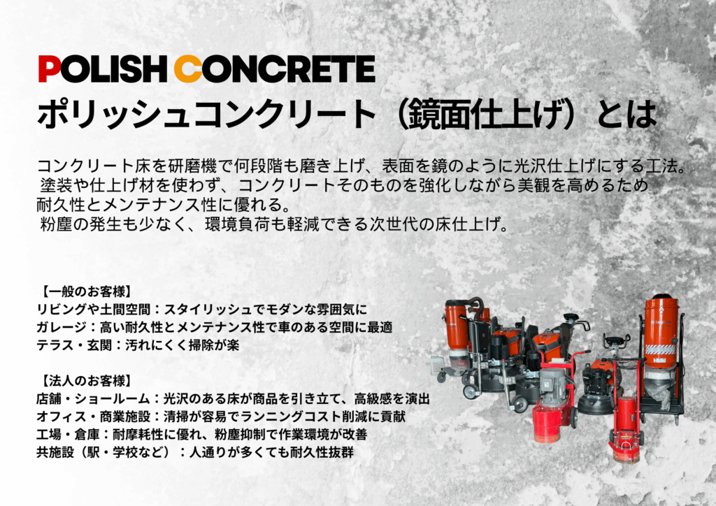 土間コンクリート打設・雨打たれ研磨・ポリッシュコンクリート・スタンプコンクリート・KL工法など各種床仕上げ工事に対応。