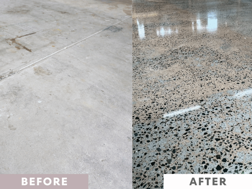 施工前の雨打たれ面と、研磨後の床を比べると一目瞭然。